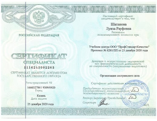 - Сертификат 1116243002263, рег. № 1660327861 9309/0920 от 25.12.2020 года, «организация сестринского дела», срок действия до 25.12.2025 года