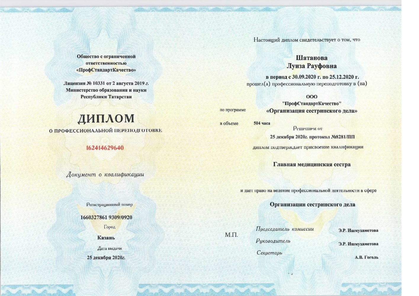 - Диплом 162414629640 рег. № 1660327861 9309/0920 от 25.12.2020 года, «главная медицинская сестра»