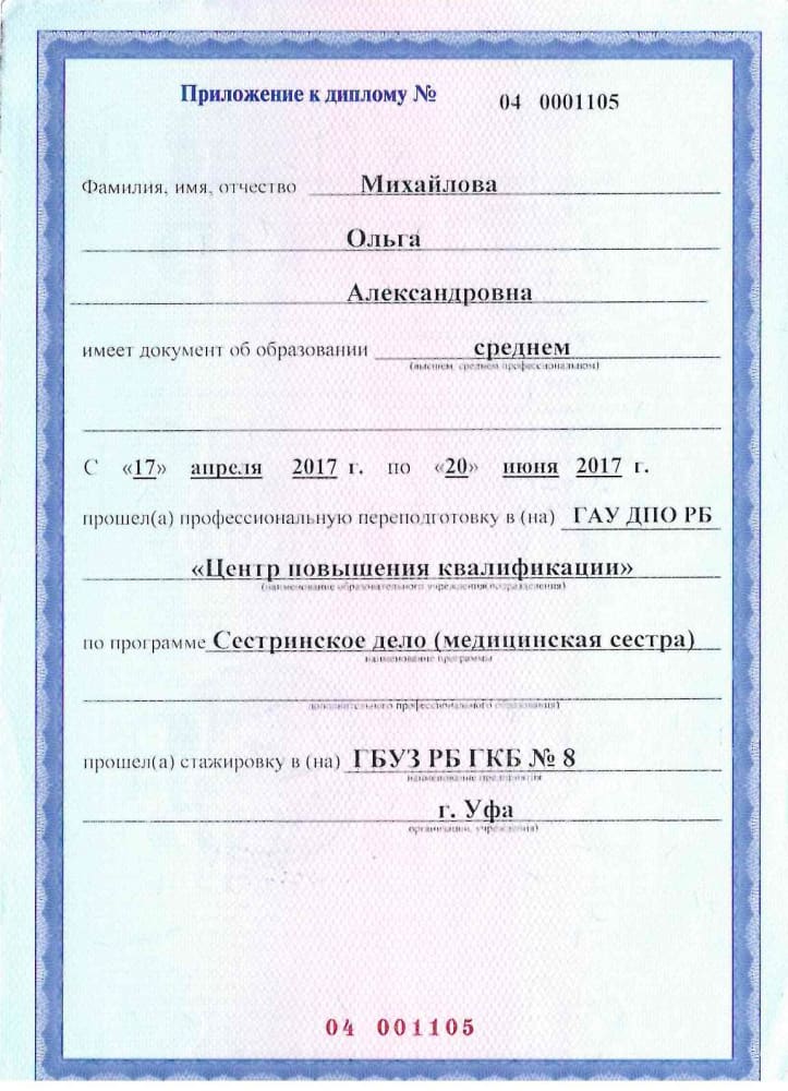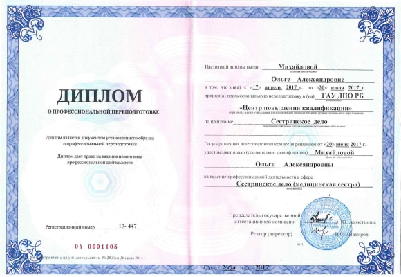 - Диплом о ПП 040001105, рег. № 17-447 от 20.06.2017 года «сестринское дело»
