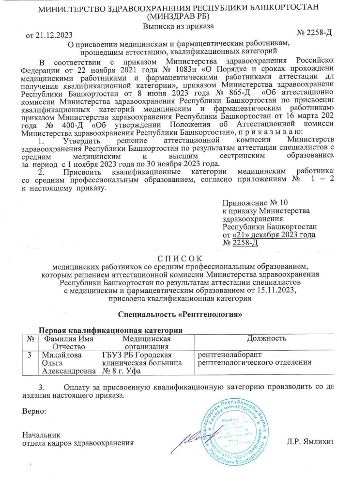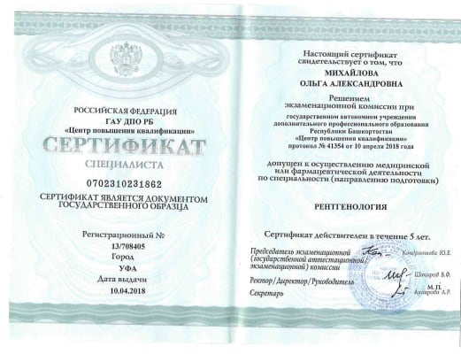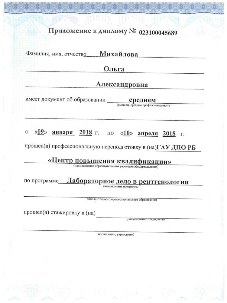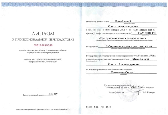 - Диплом о ПП 023100045689, рег. № Д18-209 от 10.04.2018 года «лабораторное дело в рентгенологии»