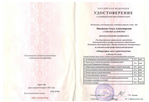 - Удостоверение о ПК 023102960855, рег. № У23-3754 от 26.04.2023 года «лабораторное дело в рентгенологии»